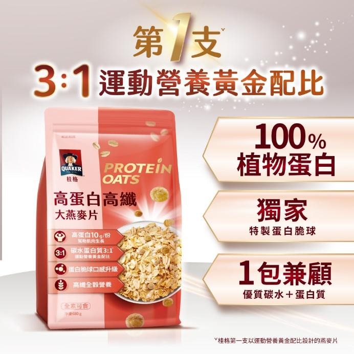 - 桂格高蛋白高纖大燕麥片:是桂格推出的第一支高蛋白燕麥,特別以營養專家建議的碳水化合物:蛋白質黃金比例 3:1配方設計,每份含 10 克植物蛋白幫助肌肉生長與 3.3 克膳食纖維有助調節體質。從忙碌上班族、輕運動者到銀髮族,皆可透過一碗桂格高蛋白燕麥,輕鬆補充全穀營養+優質蛋白。獨家特製的蛋白脆球提供獨特嚼感,讓燕麥口感體驗再升級。