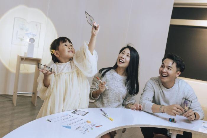 ▲在「繽紛餐桌」中,用奇異筆在透明片上自由創作,並投影出自己獨一無二的作品。