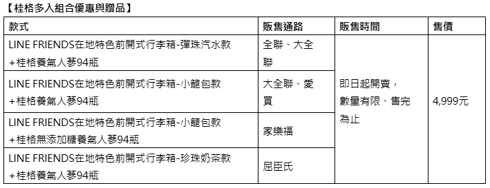 今年春節,桂格養氣人蔘更推出結合LINE FRIENDS在地特色前開式行李箱/登機箱的限量套組。只要在全聯、大全聯、愛買、家樂福、屈臣氏等指定通路購買桂格養氣人蔘或無添加糖養氣人蔘94入限量套組,就能帶走24吋LINE FRIENDS在地特色前開式行李箱 (市價4,580元),共有彈珠汽水款、小籠包款、珍珠奶茶款等多種款式,數量極為有限、售完為止,想要一次收集各種款式,也可到不同通路搶購!另外,在7-11、全家兩大超商購買76入限量套組,則可獲得20吋LINE FRIENDS在地特色登機箱 (摩托車款,市價2,990元)。