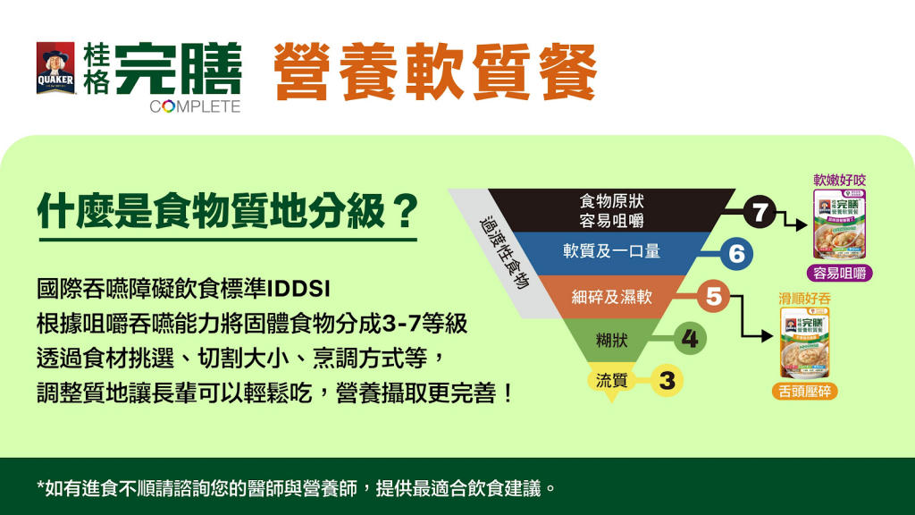 參照國際質地分級標準,方便長者選擇合適的軟質飲食。圖/桂格完膳提供