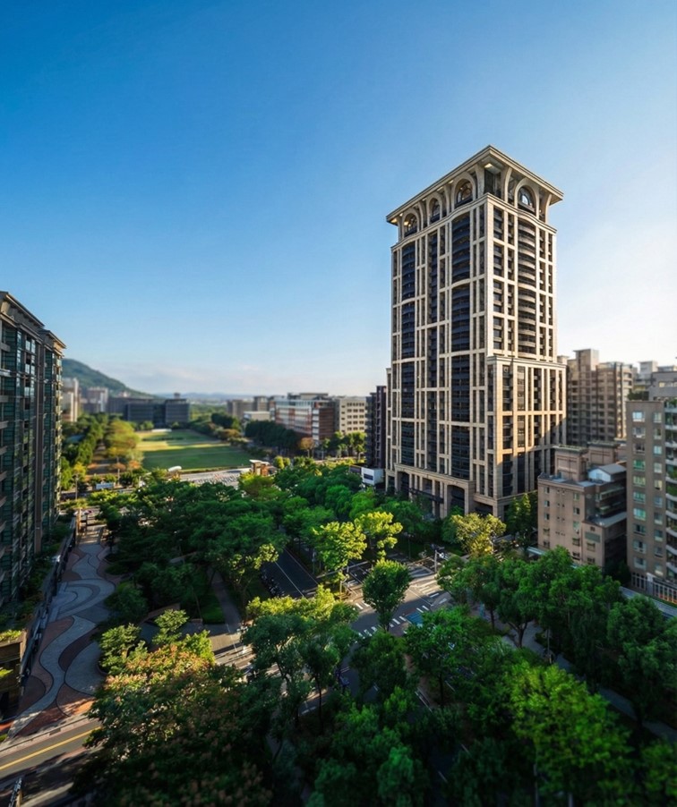 「詠藝」座落台北大學正對面的學勤路林蔭大道上,擁有面積1597坪、雙面臨路完整基地,堪稱北大特區難得一見的完整角地條件。外觀設計特別禮聘國際知名P&T集團操刀,以經典石材語彙勾勒出凌空27層的對稱平衡美感,成為區域內極具識別度的垂直地標。在建築之外,亦攜手瀚翔景觀,以細膩尺度梳理中庭與綠意動線,讓自然不只是圍繞建築,而是成為生活的一部分。