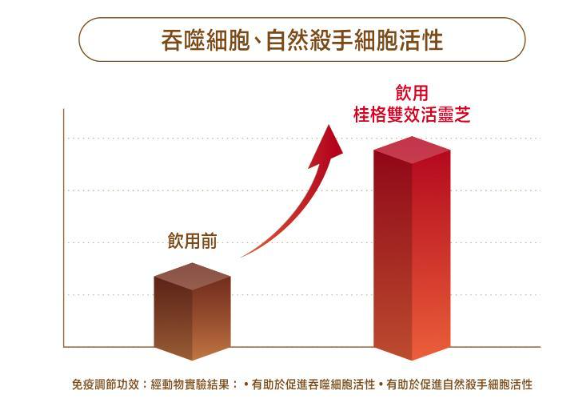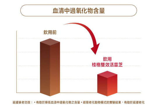 **桂格雙效活靈芝滋補液獲國家健康食品許可(衛署健食字第A00162號),具「免疫調節」與「延緩衰老」功能 (延緩衰老功效:有助於降低血清中過氧化物之含量,經易老化動物模式的實驗結果,有助於延緩老化。免疫調節功效:經動物實驗結果,有助於促進吞噬細胞活性,有助於促進自然殺手細胞活性)